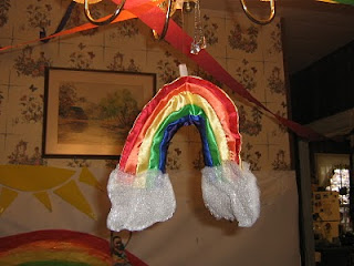 Incidently, although I may watch cake boss, I so am not of Buddy's caliber! LOL Last night I baked a round white cake. It stuck to the pan. This is covered by frosting. Frosting is what cakes are all about anyway! Especially when you are 6! Then I baked the 2 rainbow shaped sugar cookies and decorated them with sparkly gel. Then I put the 2 rainbows togehter with frosting to "glue" them and mounted them on the back of the cake. With cloud shaped cookies on either side of the rainbow. It was stunning. . . until the gel began to drip slowly down from the rainbow! ROFL